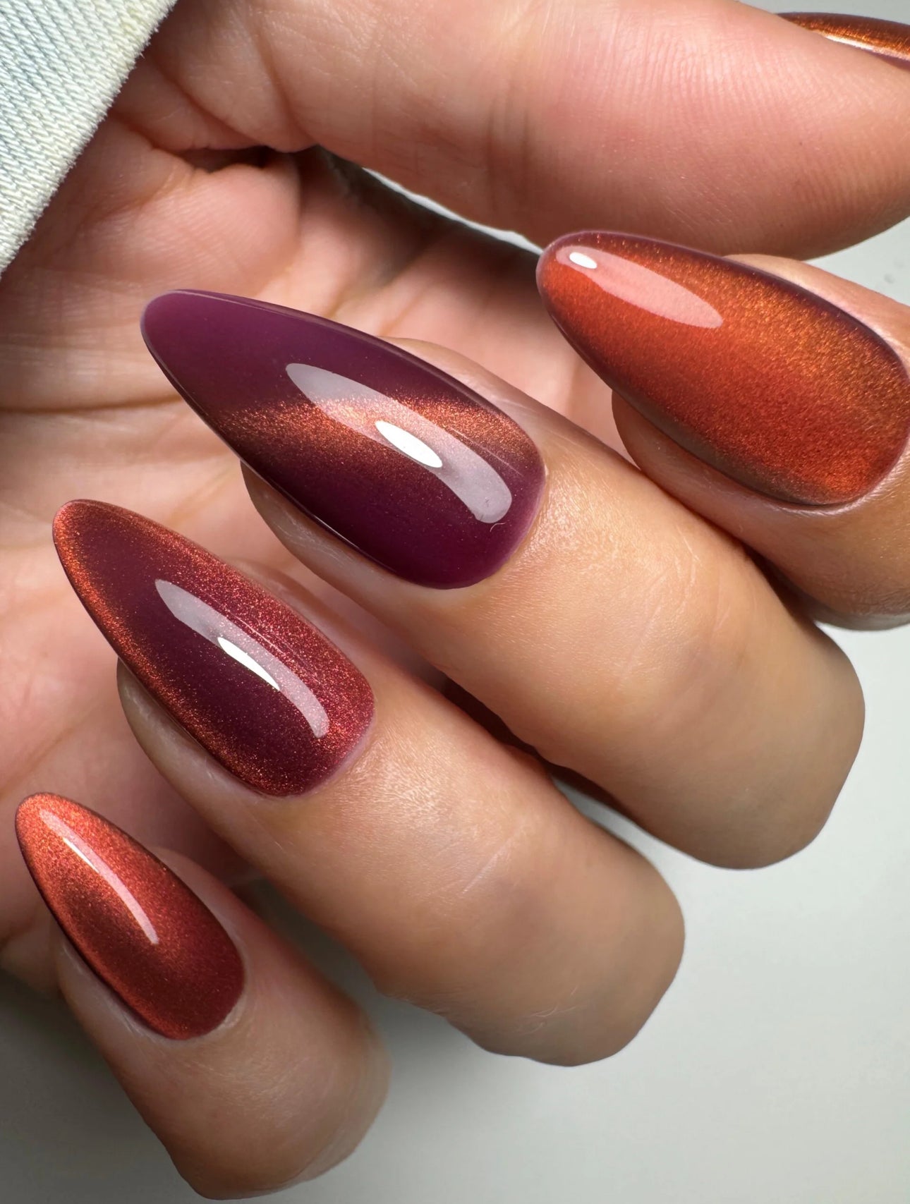 6. Breng een laagje cat eye gelpolish aan en hard uit onder een LED/UV lamp