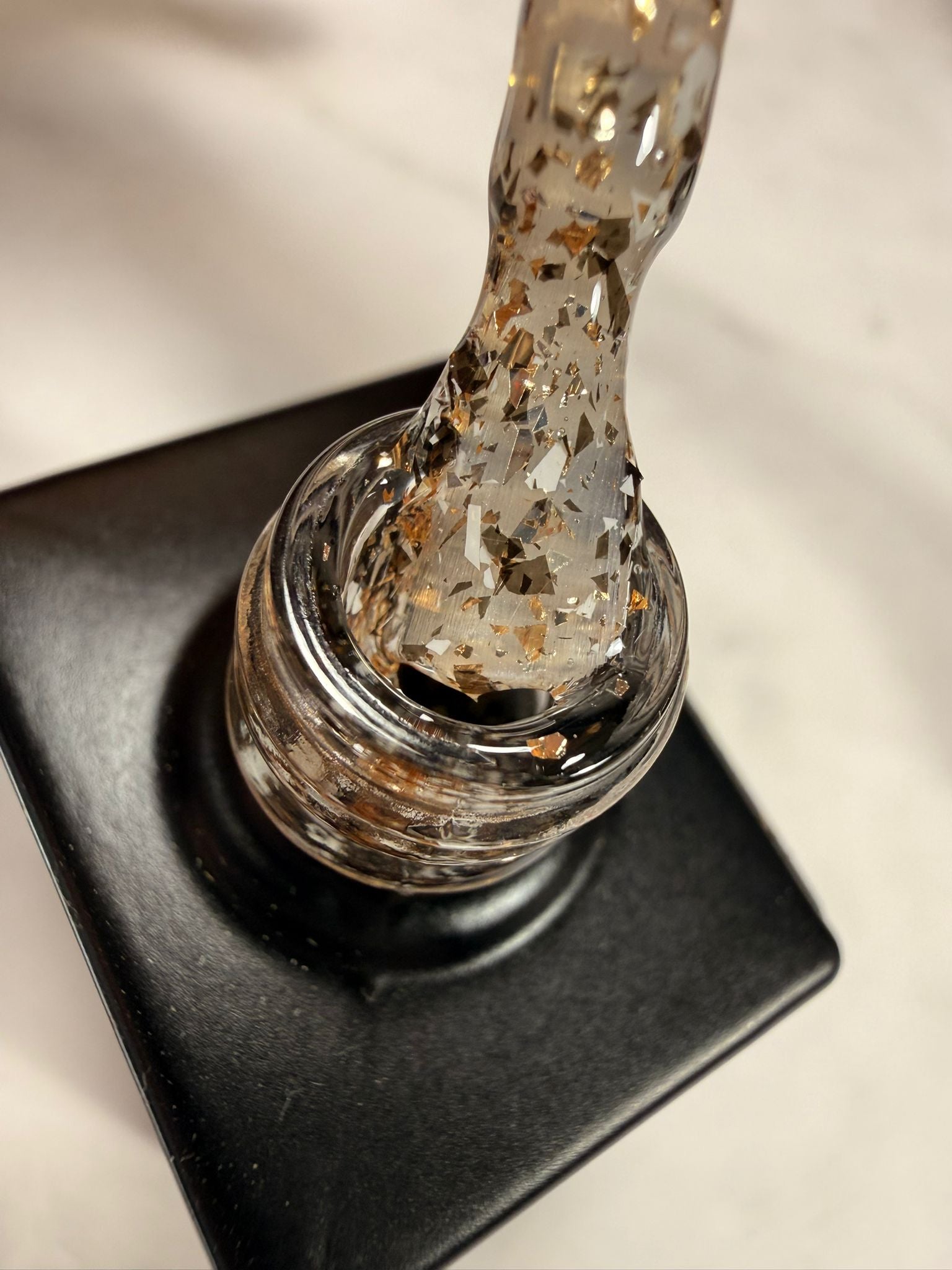 Deze topcoat heeft grote en kleine witte, zwarte en gouden flakes.